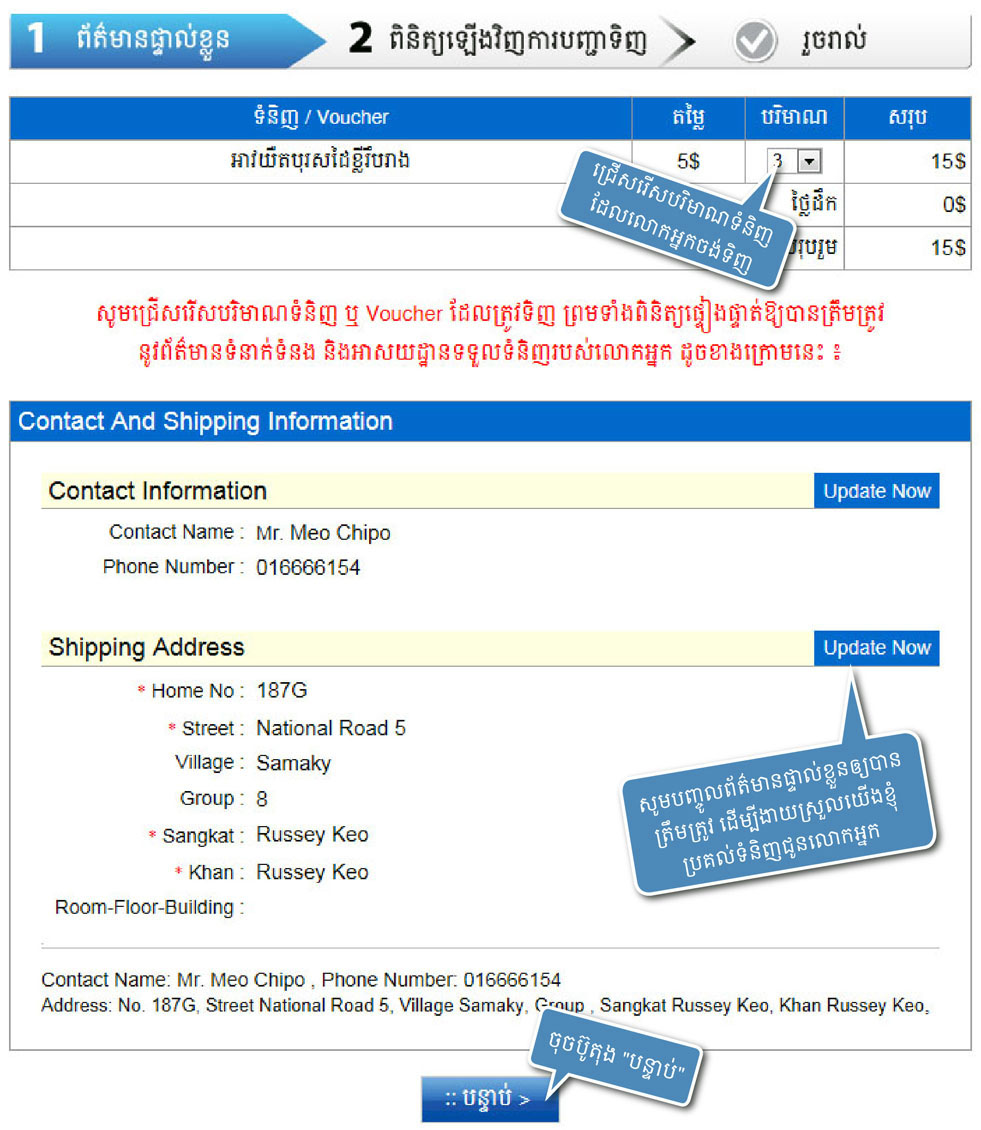 | សូមលោកអ្នកវាយបញ្ចូល ឬពិនិត្យអាសយដ្ឋានទទួលទំនិញដូចជា ឈ្មោះនិងលេខទូរស័ព្ទ, សរសេរឲ្យបានច្បាស់លាស់ លេខផ្ទះ, លេខផ្លូវ, ភូមិ, សង្កាត់, ខណ្ឌ ដើម្បីងាយស្រួលដល់បុគ្គលិក ដឹកជញ្ជូនទាក់ទងប្រគល់ទំនិញជូនលោកអ្នក។ លោកអ្នកក៏អាចកែសម្រួលព័ត៌មានផ្ទាល់ខ្លួនបាន ដោយគ្រាន់តែចុចលើពាក្យ Update Now ។ បន្ទាប់មកសូមចុចប៊ូតុង “បន្ទាប់” |