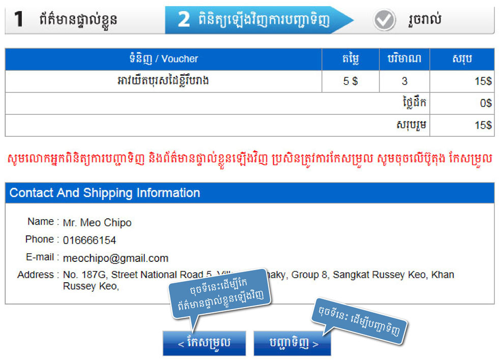 | ជំហានទី២ ៖ ពិនិត្យឡើងវិញការបញ្ជាទិញ |