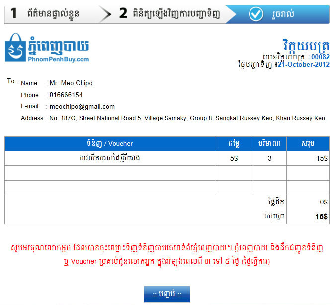 | បន្ទាប់ពីចុចប៊ូតុង “ទិញភ្លាម” លោកអ្នកត្រូវតែអនុវត្តជំហានទាំង៣ដូចខាងក្រោម ដើម្បីបញ្ជាទិញ ៖ |
